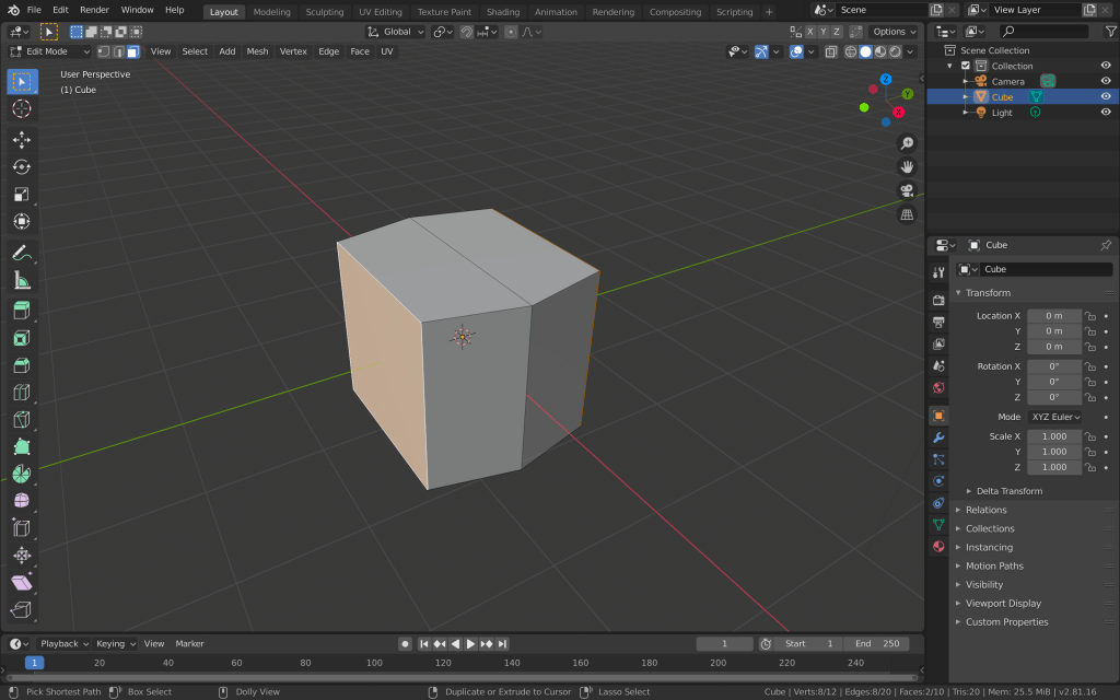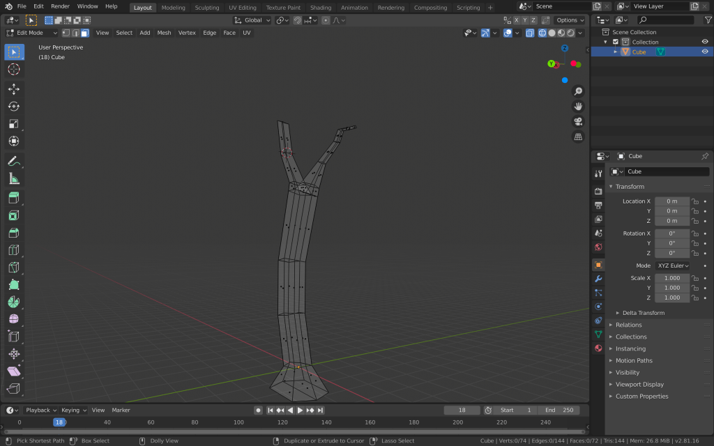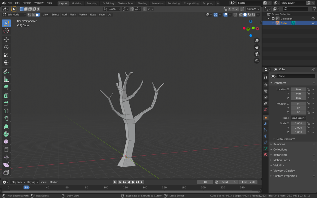 Another environment prop I wanted to do was the trees for the first level. I started like most of the props with a cube mesh. I made a loop cut trough the middle and scaled the faces.
