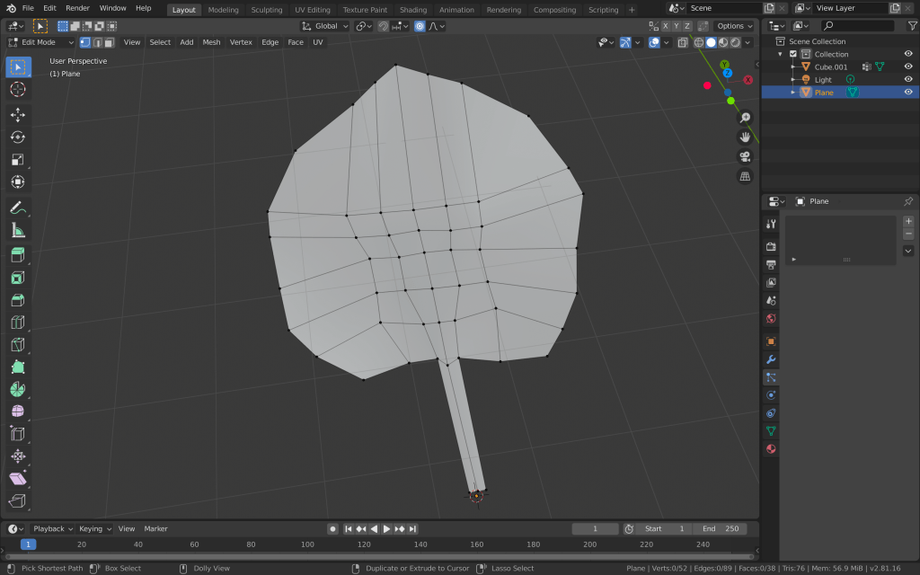 Once the trunk and branches were done, I started creating the leaf. I added a new plane and after many loop cuts and vector editing, I ended up with a relatively acceptable leaf.
