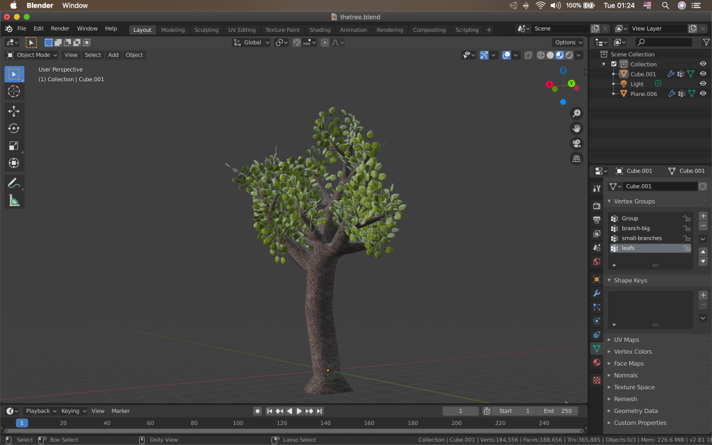 I then moved to creating a vertex group from the tree branches where the leaves are going to attach. I selected the vertices I wanted and then went in to weight paint mode to tweak it more. I then added a new particle system to the tree mesh and changed the particle type to hair. I changed the render mode to object and added the leaves object I created before. This way I replaced the particles with the leaves. I added the branch vertex group to the density vertex groups and increased the number of leaves to 300. I also changed other settings like the rotation length and randomness. I played with the particle settings for a while until I got the result I wanted. After that I went in the modifier’s tab and applied the particle system. This made all of the leaves in. individual objects. I made new vertex groups. One from the leaves and one from the tree itself. This way I can manipulate them individually (texture them) even after I make them one mesh. I then selected all of the leaves and the trunk and joined them together. After that I applied some image textures to the from the source I used before, edited the UVs and reduced the noise of the trunk texture.